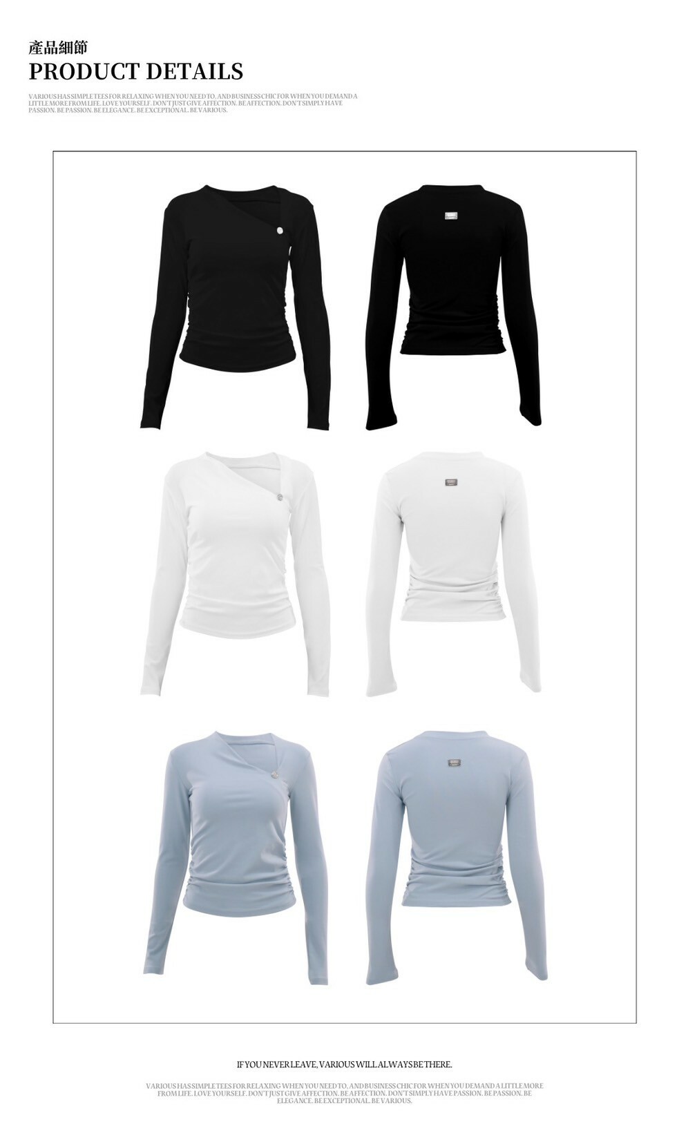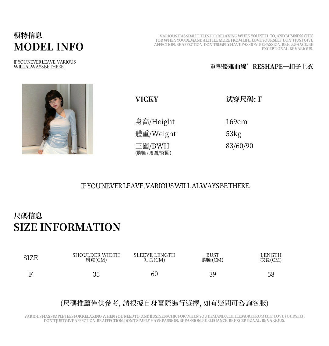 • 尺寸表皆為水平測量,會因布料彈性、水洗處理、測量起訖點等因素,