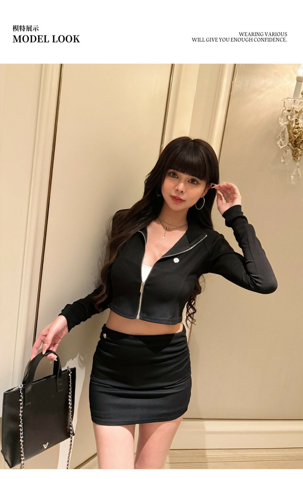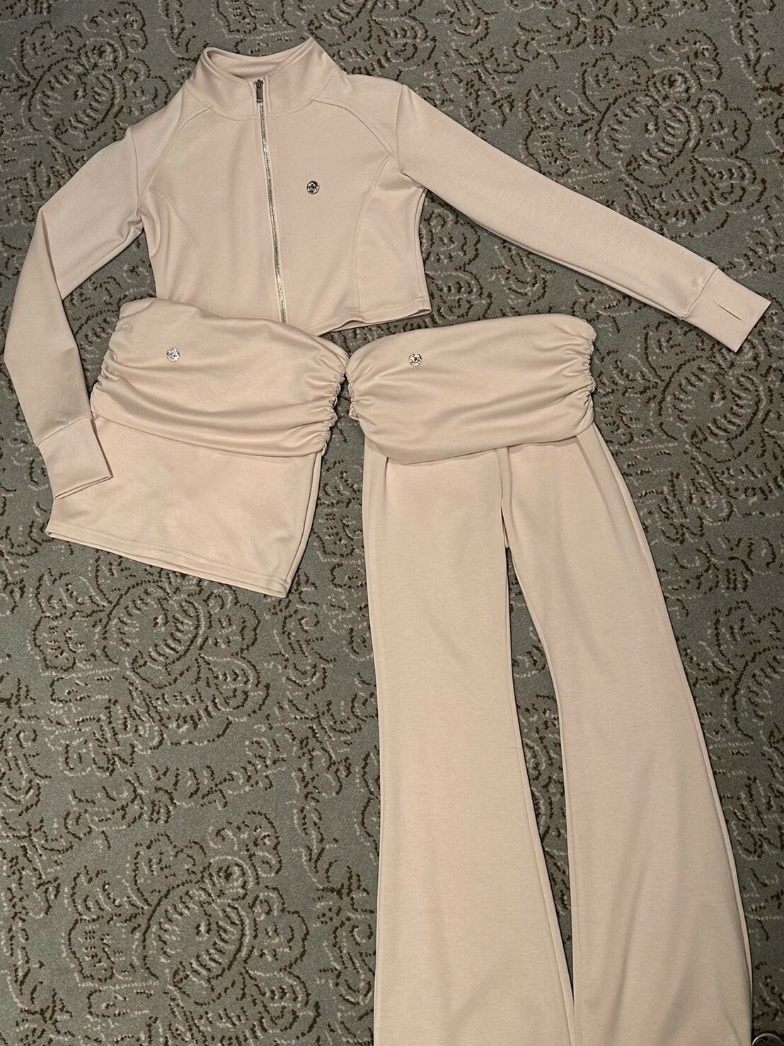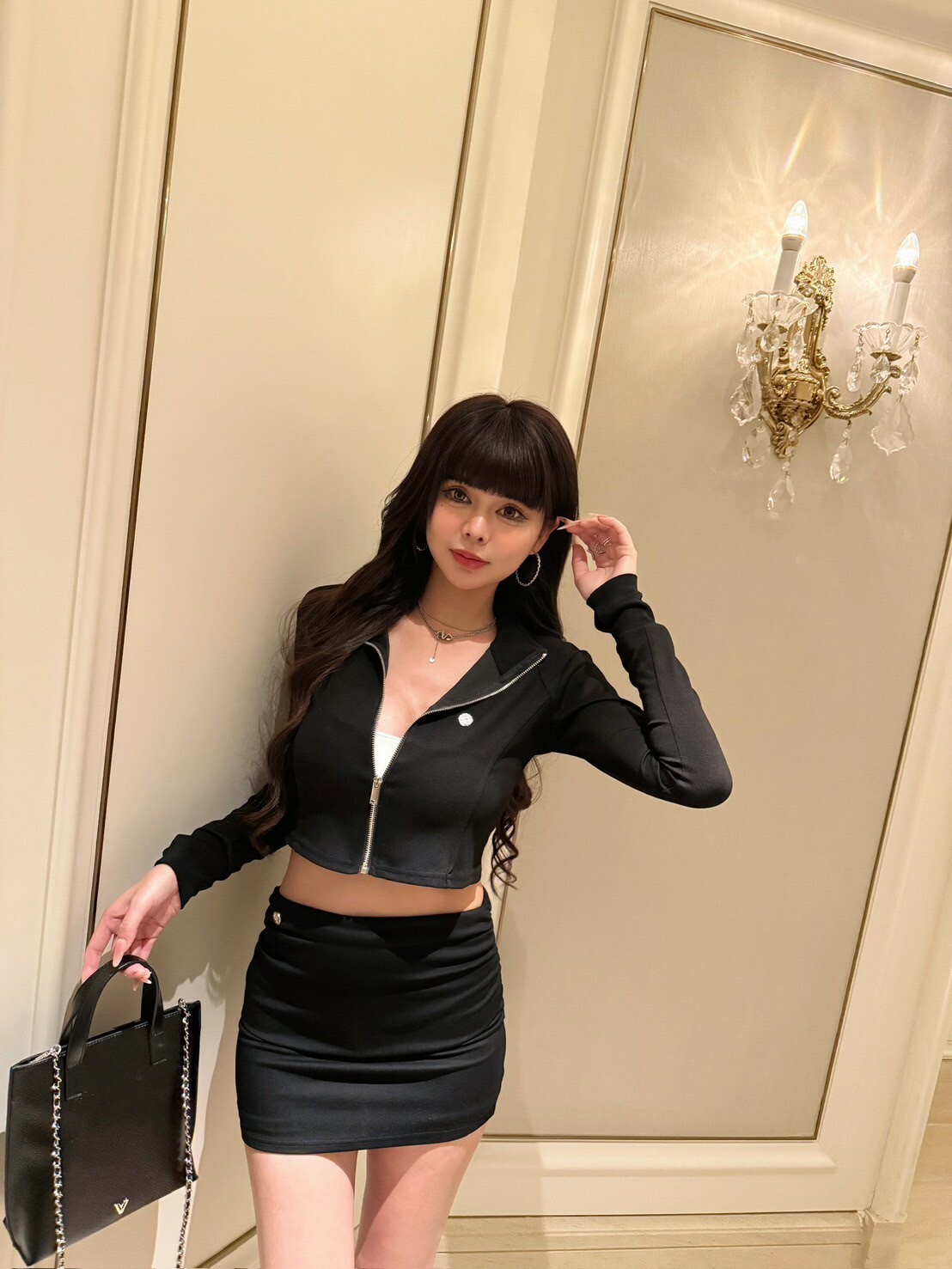 立裁短版連帽外套+精緻的包臀短裙+長腿喇叭褲
